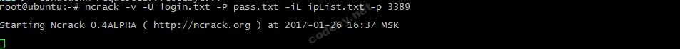 #  ncrack -vv -U login.txt -P default.pwd -iX result.xml -oN result.txt  CL=1