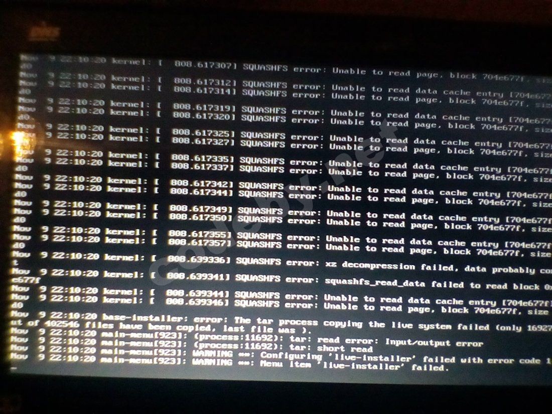 Также посмотри лог установки (если не ошибыюсь ctrl+alt+f4), если будут эроры "S QUASHFS read " вероятно USB флешка секторы битые.