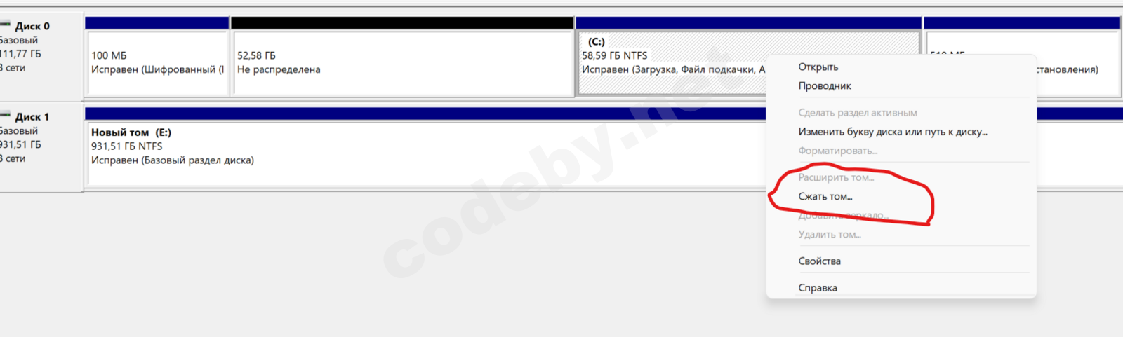 Попробуй загрузиться с live usb, там acronis или чем ни будь подобным поделить, как коллега посоветовал. Похоже винда тупит не чего нового.Если нажать на диск С можно увидеть что том нельзя расширить, а только сжать, честно говоря не знаю что делать в таком случае и с чем это может быть связано, там где область не распределена, когда-то был виндовс 10 но я его форматировал.