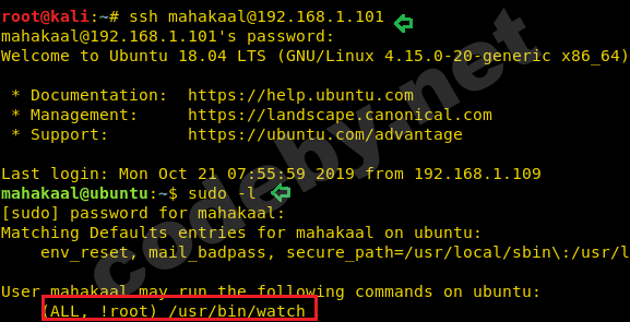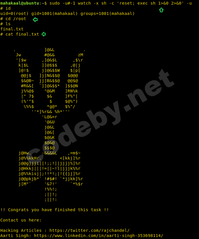 sudo -u#-1 watch -x sh -c 'reset; exec sh 1>&0 2>&0' -u
