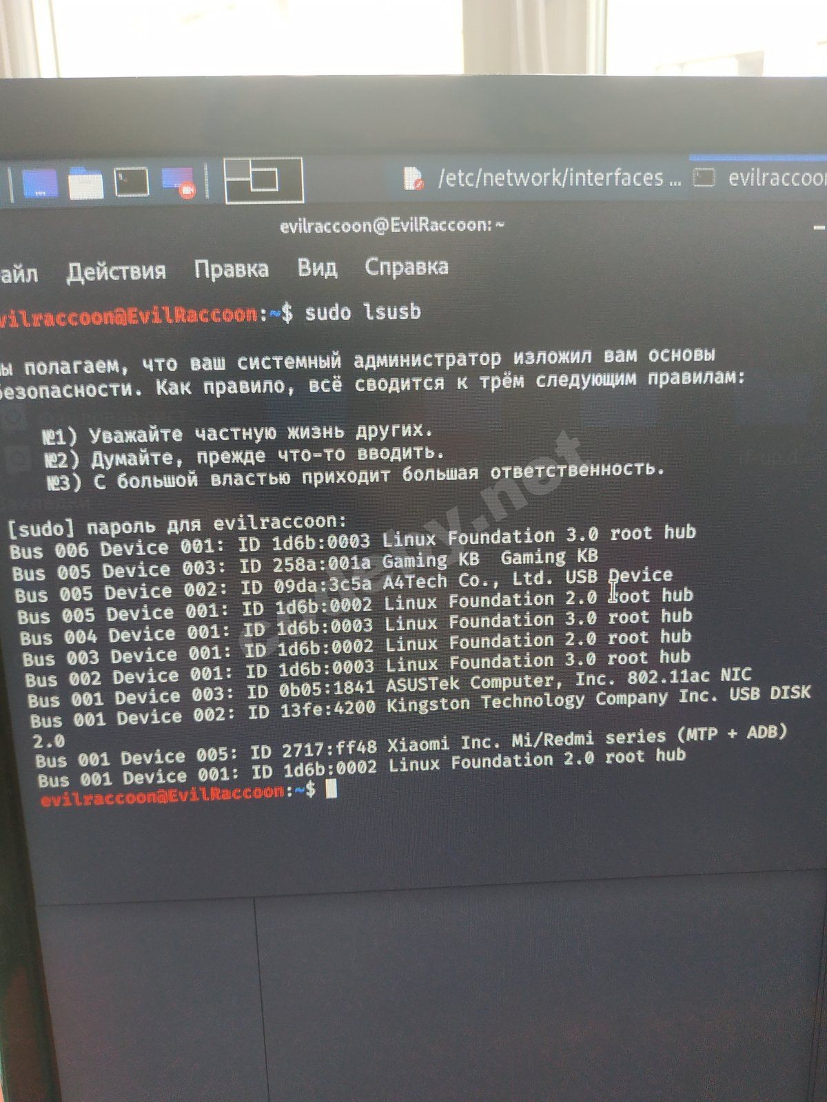 $ sudo lsusb # эта команда нужна для того, чтобы узнать, определяется ли беспроводной интерфейс системой
