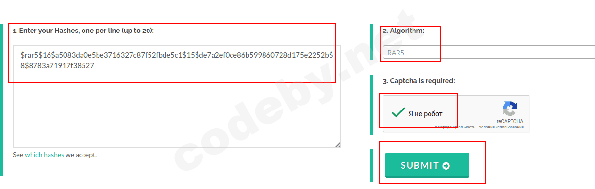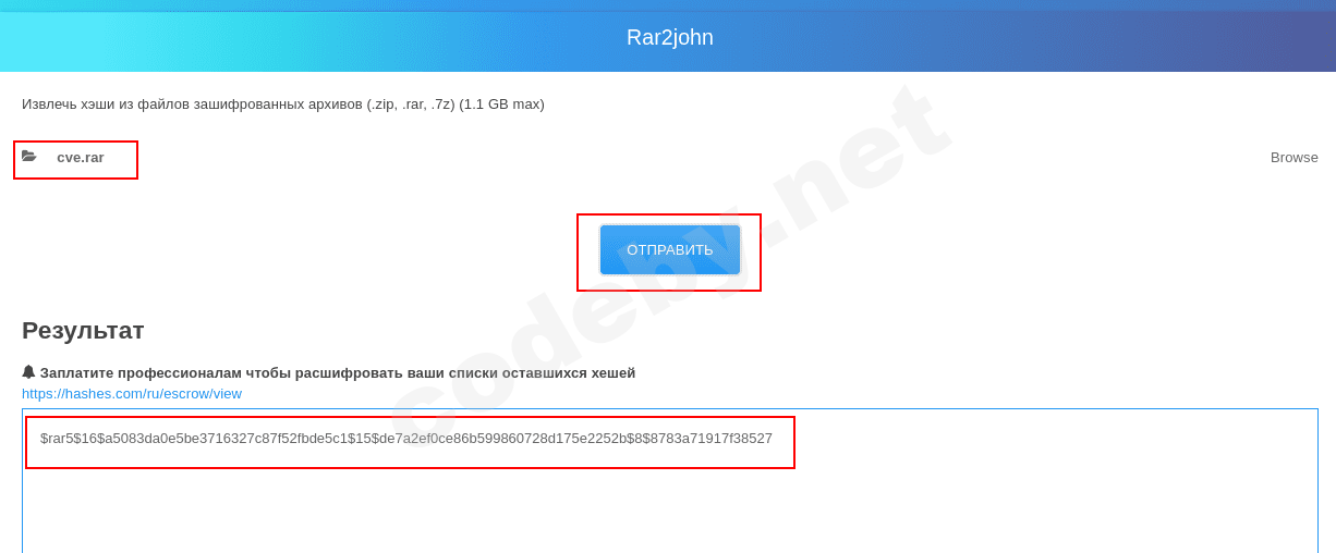 1. Идем на сайт Извлечь хэши из файлов зашифрованных архивов (.zip, .rar, .7z) и там извлекаем хеш пароля: