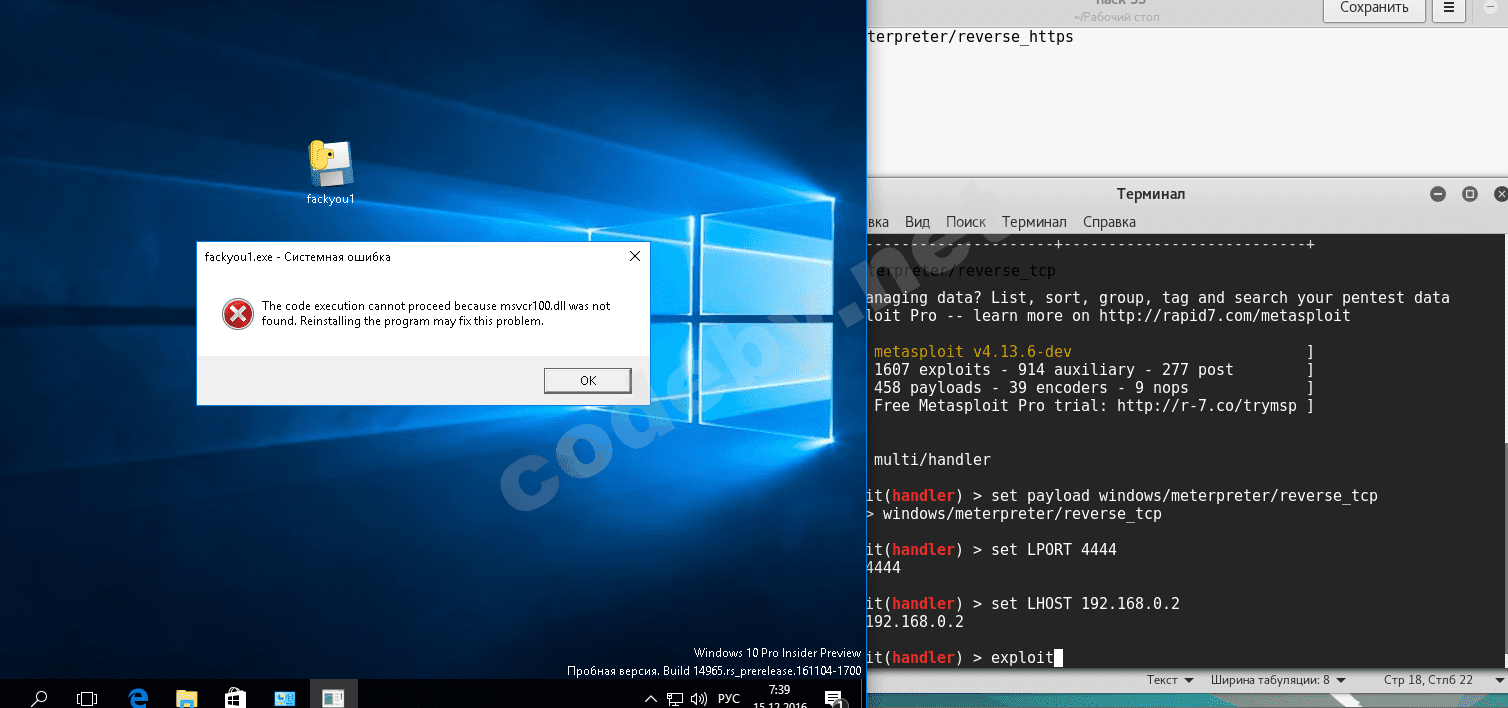 @Vander Подскажи ,что за ***.. все сделал по твоей статье ..Сгенерировал вирусный файл в Veil , закинул на виртуальную машину (пробовал на windows 7 32bit, windows 10)..но вот беда ): при попытки открыть файл выдает ошибку msvcr100.dll . Как решить данную проблему ? Пробовал на обоих виндах ..устанавливать direx,visual c++ ,а так же пробовал в Veil выбирать 32.34