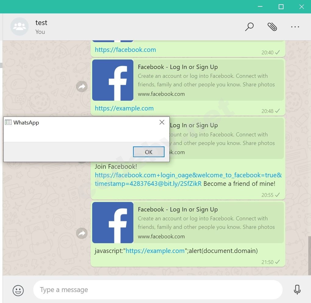 При нажатии на сообщение в собственных мобильных приложениях WhatsApp обычно открывается https://example.com вместо запуска XSS (очевидно, потому что XSS редко имеет отношение к нативным мобильным приложениям).