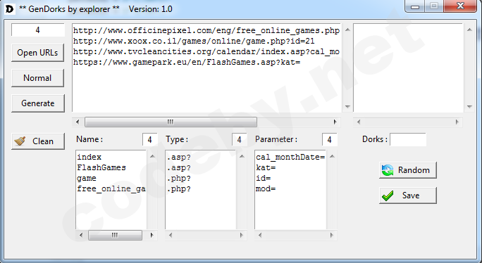 В нижнем поле URL будут появляться ссылки. Для примера, трёх ссылок будет достаточно, которые мы сохраняем в текстовый файл. Это файл открываем в следующей программе – DorkCombine. Пользоваться ей очень просто – тыкаете по всем клавишам подряд сверху донизу :)