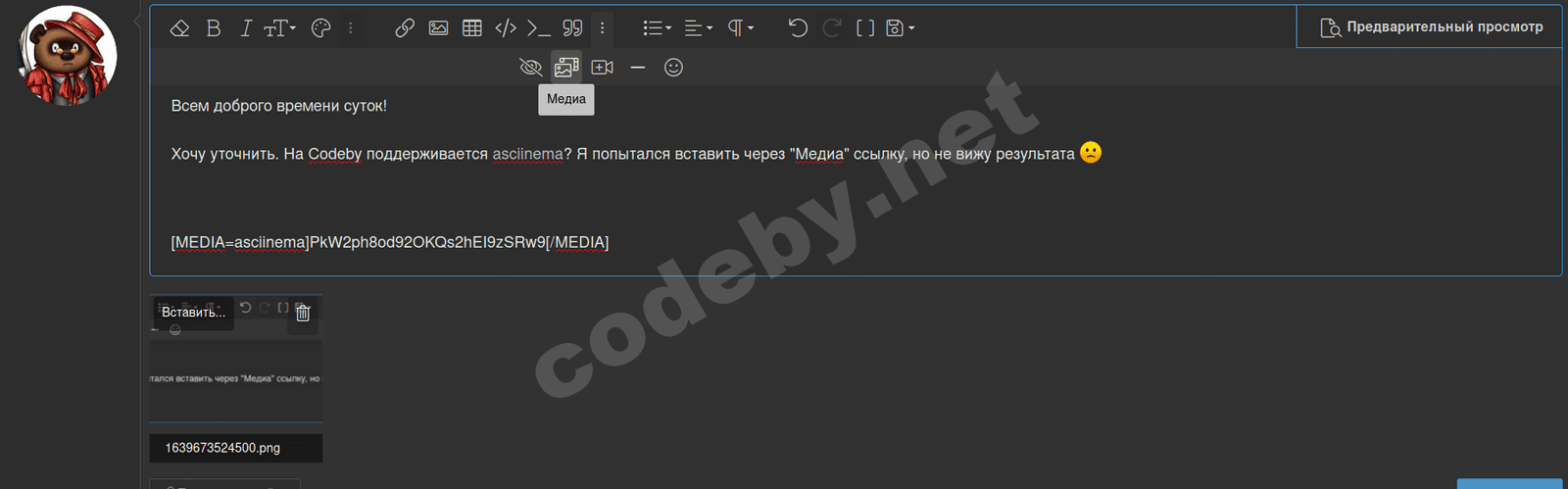 Я уточню мой вопрос в этой теме. На Codeby поддерживается asciinema? Я попытался вставить через "Медиа" ссылку, но не вижу результата