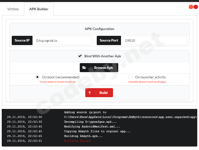 В логах уже видно, что есть один подключенный девайс, но сначала необходимо, создать RAT-файл .apk. В этом нам поможет APK Builder. Есть два варианта создания приложения, чистый AhMyth файл и скрещивание RAT с существующей программой.