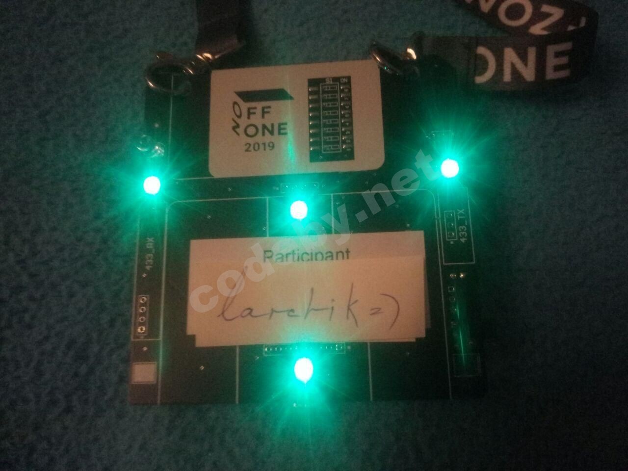 Одна из главных фишек сей банкета, стал бейдж, на него можно было припаять различные элементы, попутно решая разные таски, а также он выступал своего рода кошельком для внутренней валюты Offcoin,её можно было обменять на всякий интересный лут в магазине. Бэйдж из себя представлял плату напечатанную в виде дискеты, более подробно можно прочесть на хабре, ссыль конечно же прилагаю : Текстолит вместо картона. Пара слов об интерактивном бейдже OFFZONE 2019