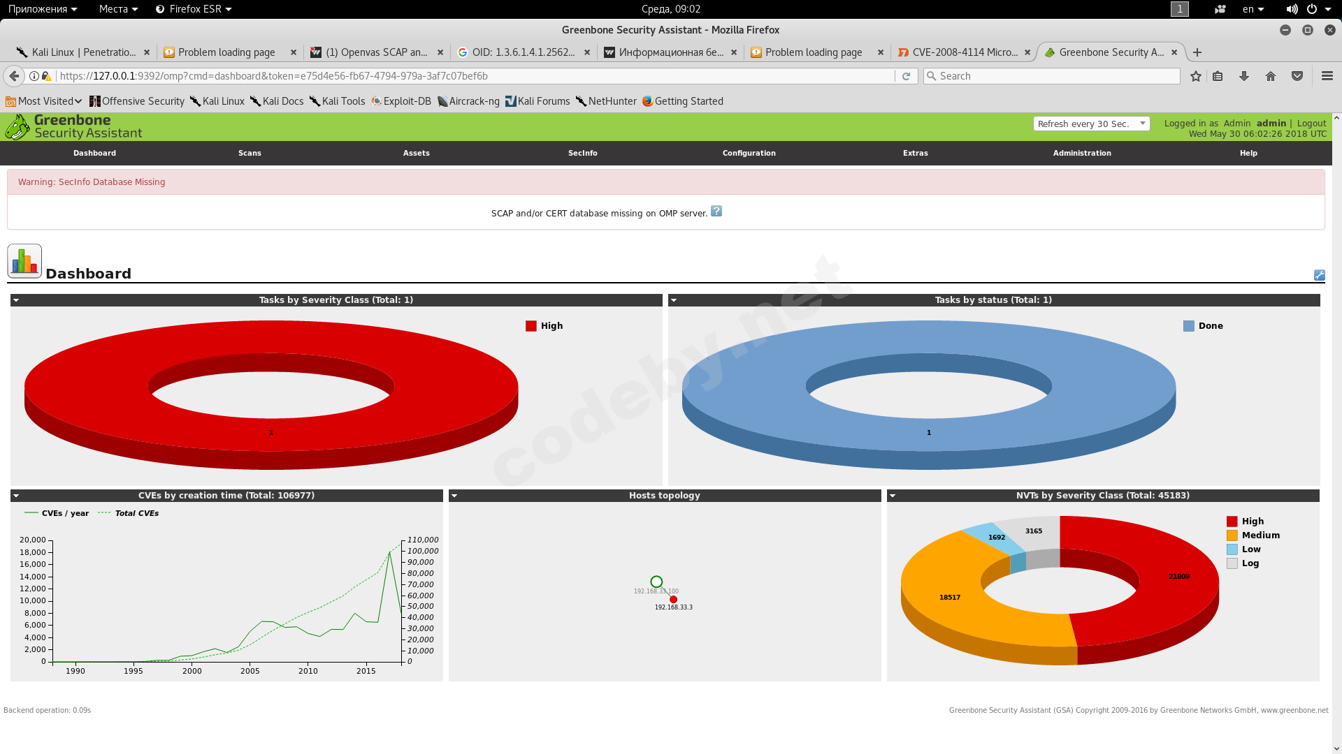 Установил Openvas при заходе в админку вылезает такое предупреждение, как я понял не может обновить базу, но решения не нашел.