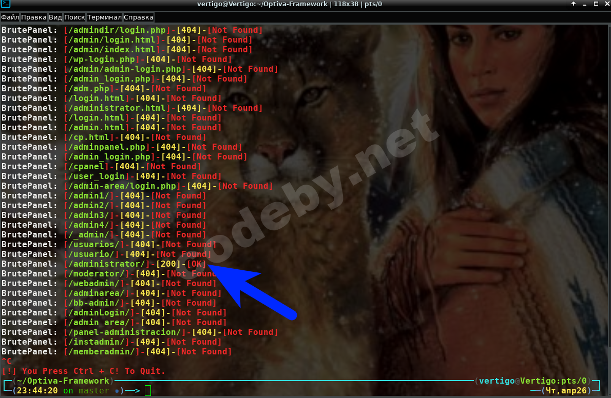 Привожу пример , как он нашёл админ панель. При этом он продолжил поиски , пока его не остановил.