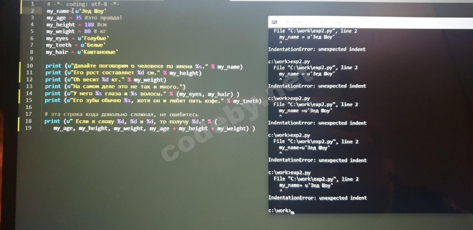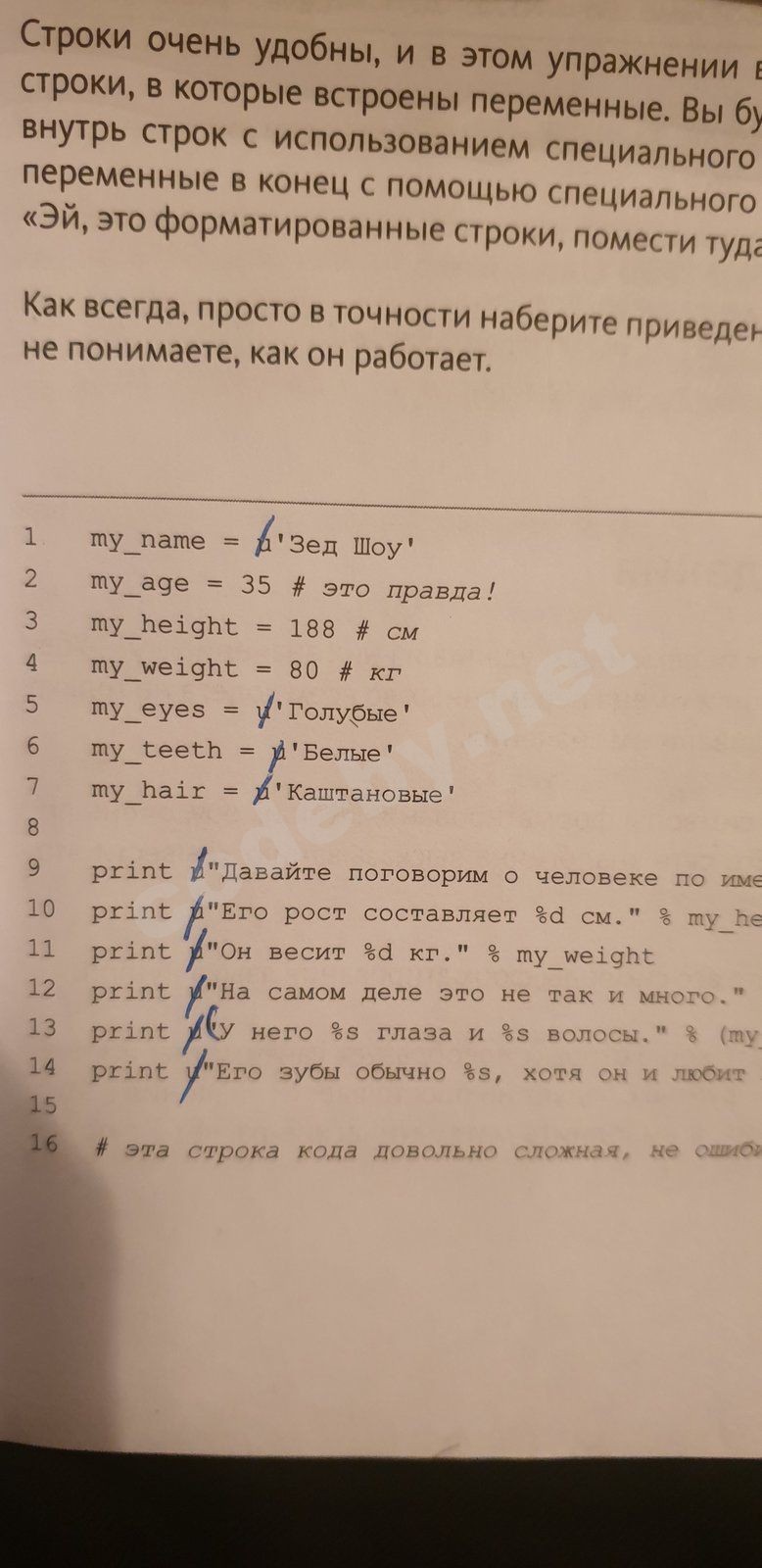 print (u"У него %s глаза и %s волосы.") % (my_eyes, my_hair)