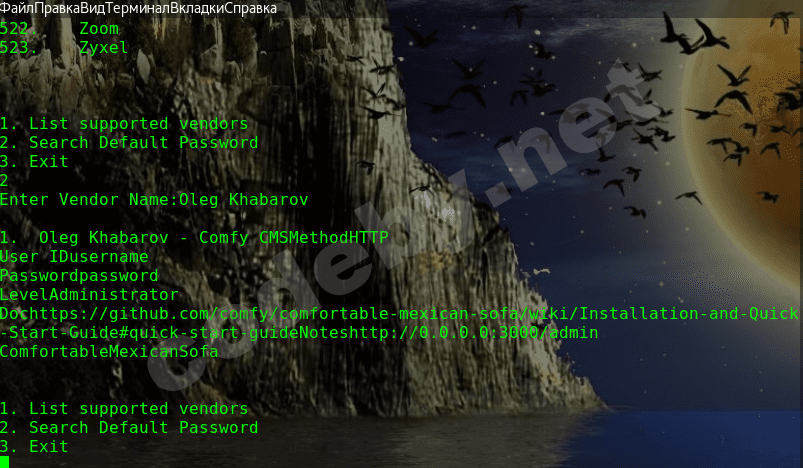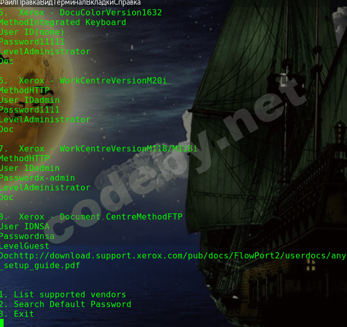 Обладает базой наименований 523 поставщиков ,включая 2084 пароля по-умолчанию к устройствам.