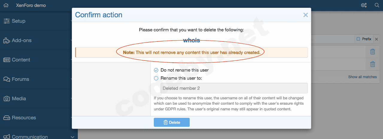 Обратите внимание, при удалении пользователя мы видим предупреждение, что контент, созданный данным пользователем, не будет удален. Значит файлы пользователя при его удалении остаются на сервере.