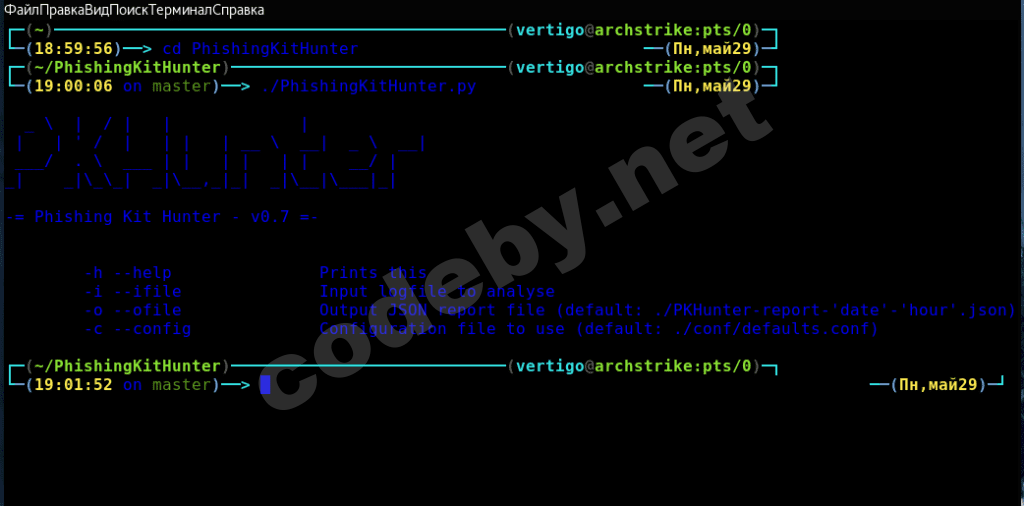 Запуск и вывод опций : # . /PhishingKitHunter.py --help