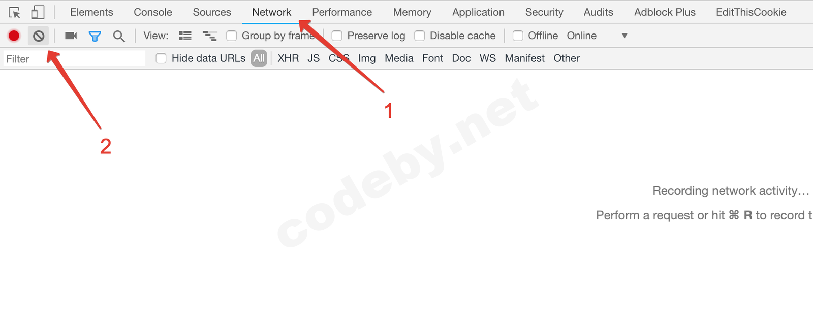 Перейдем на вкладку Network и очистим все запросы чтобы легче было найти нужный запрос после отправки формы.