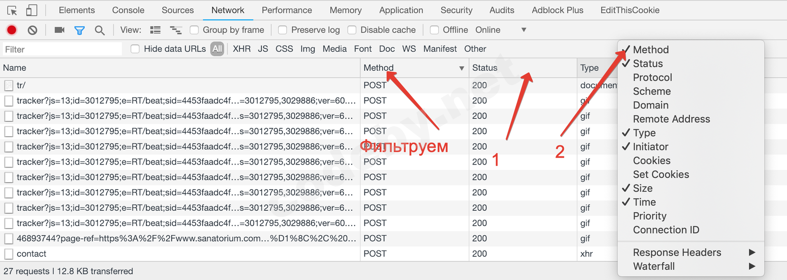 Если данной колонки нет нажимаем правой кнопкой мыши на status и выбираем method. Затем начинаем искать запрос. Нажимаем на каждый запрос и ищем содержимое form data которое будет соответствовать заполненным данным при оправке.
