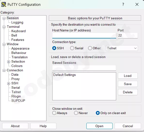 В поле Host Name вписываем ту же форму UserName@IPaddress и нажимае Open