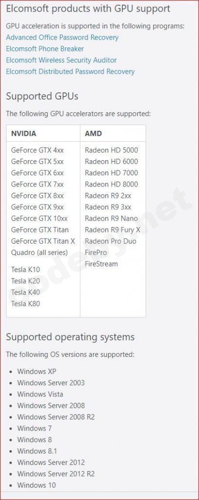 - Компания Elcomsoft имеет сертификаты Microsoft Gold Certified Partner, Intel Software Partner, NVIDIA Developer Support