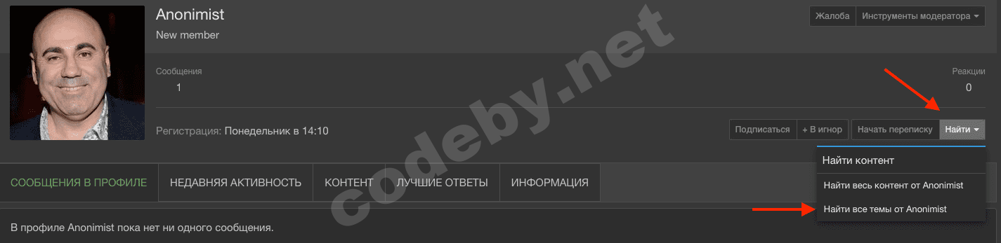 Либо можно посмотреть все темы конкретного пользователя через его профиль (есть специальная кнопка).