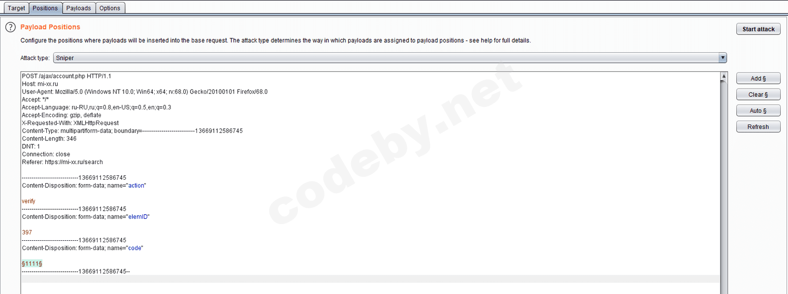 Для этого вводим код, нажимаем на кнопку "Отправить". Перехватываем запрос при помощи Burp и направляем его в Intruder.