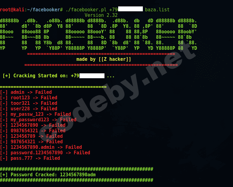 Просмотрев далее я нашел номер телефона пользователя. Проверив его на принадлежность к аккаунту начинаю брутить. Для этого понадобится скрипт facebooker