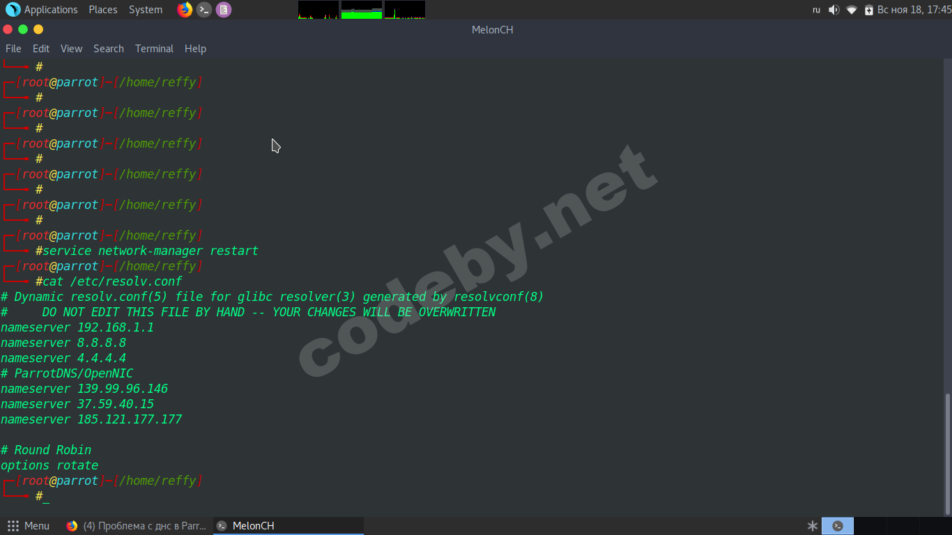 Недавно установил себе на ноутбук Parrot Security OS,открываю браузер,ввожу сайт (допустим yg140.servegame.com или vk.com),ничего не грузится(и да,я устанавливал днс сервера в network-manager),но суть в том,что в wireshark показывается что запросы на днс сервер идут,а ответа не получают (в iptables 53 порт не блокируется),что делать?