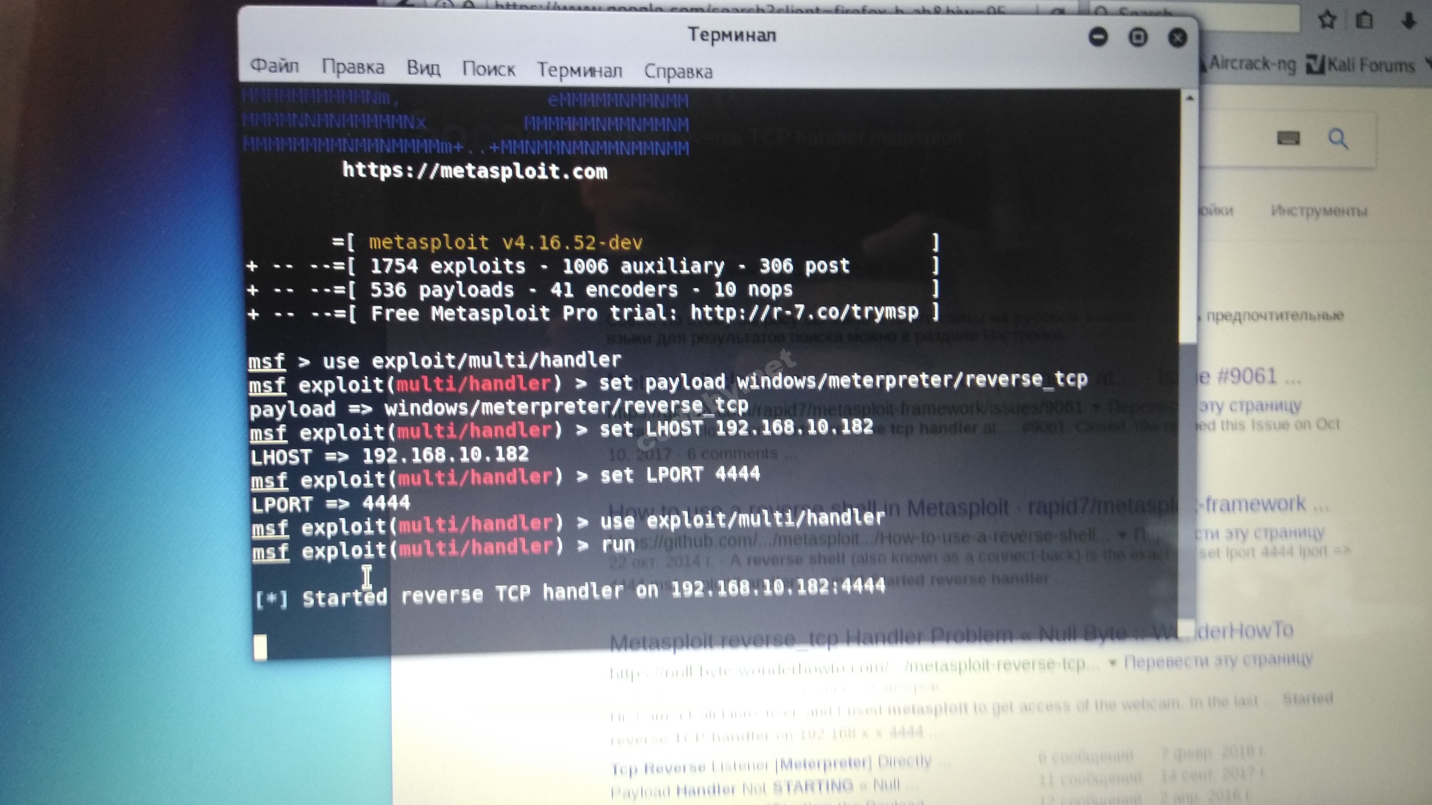 Меня лично уже настораживает вторая строка. Ни в одном туториале я не видел, чтобы в круглых скобках было "multi/handler", а не "handler". Однако, проблема в том, что reverse TCP handler вроде бы запустился, а payload handler не стартует, а значит ни о каком сеансе meterpreter не может быть и речи. Использую Windows 10, в Kali 2.0 такая же проблема. Версия metasploit 4.16.37. В чем проблема, как ее решить?