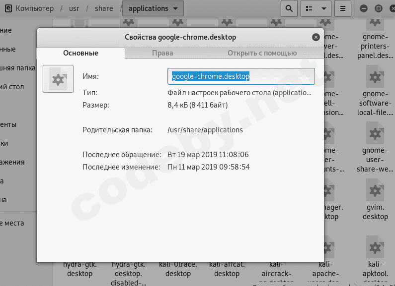 Дальше в /usr/share/applications нужно было вывести свойства файла google-chrome в строке