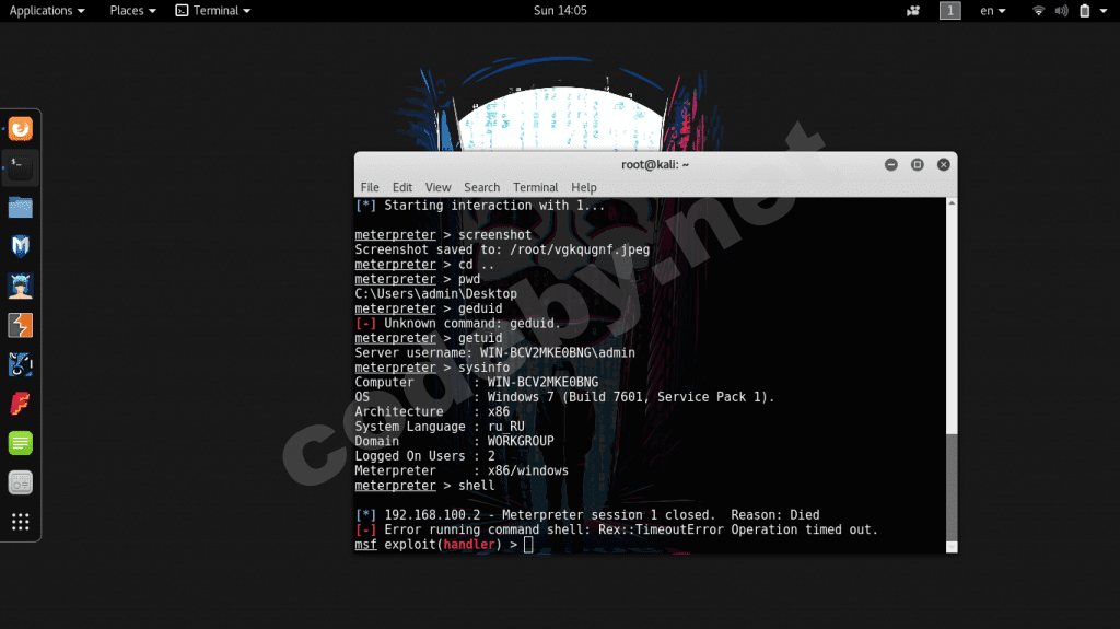 Решил попробовать установить удалённый контроль над другим ПК через нагрузку meterpreter/reverse_tcp. Сессия есть, все функции выполняются кроме команды shell. Стоит лишь вызвать шелл, как сразу сессия "теряется".