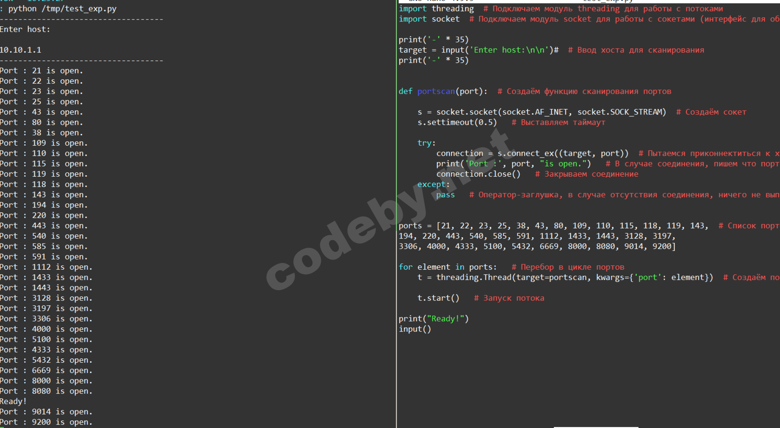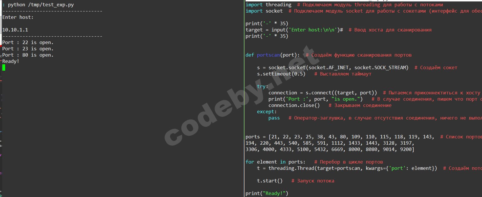 print('Port :', port, "is open.")   # В случае соединения, пишем что порт открыт