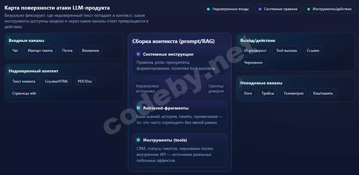 Scope разумно описывать как карту системы. Для условного помощника саппорта это включает входные каналы (чат, импорт тикета, почта), системные инструкции и шаблоны, контекстные источники (база знаний, вложения, история диалога, память), инструменты (CRM, статусы тикетов, черновики писем) и выходные каналы (UI‑рендеринг, ссылки, логирование, телеметрия). Особое внимание стоит уделять тому, где внешний текст попадает внутрь контекста, потому что именно там часто рождаются косвенные инъекции.