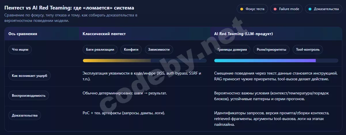 Классический пентест ищет уязвимости в реализации: ошибки авторизации, неверную обработку ввода, слабые конфигурации, опасные зависимости. В LLM‑сервисе ущерб может возникнуть без явного бага в коде. Часто слабое место появляется на границе смыслов: текст считался данными, но стал инструкцией, а модель решила, что ей действительно нужно этому следовать.
