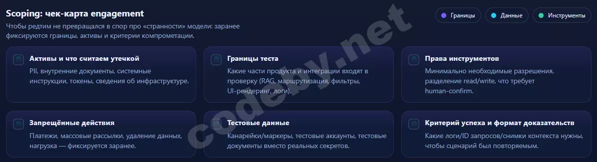 Правила engagement - это способ сделать тест безопасным и юридически чистым. В них фиксируется, какие типы атак разрешены (например, попытки обойти ограничения, попытки спровоцировать tool‑вызовы, попытки утечек), а какие запрещены (реальные платежи, массовые рассылки, удаление данных, агрессивная нагрузка). Там же описывается подход к чувствительным данным: тестовые аккаунты, тестовые документы, канарейки и маркеры вместо реальных секретов. И обязательно - формат доказательств: идентификаторы запросов, логи, условия, при которых сценарий стабильно воспроизводится.
