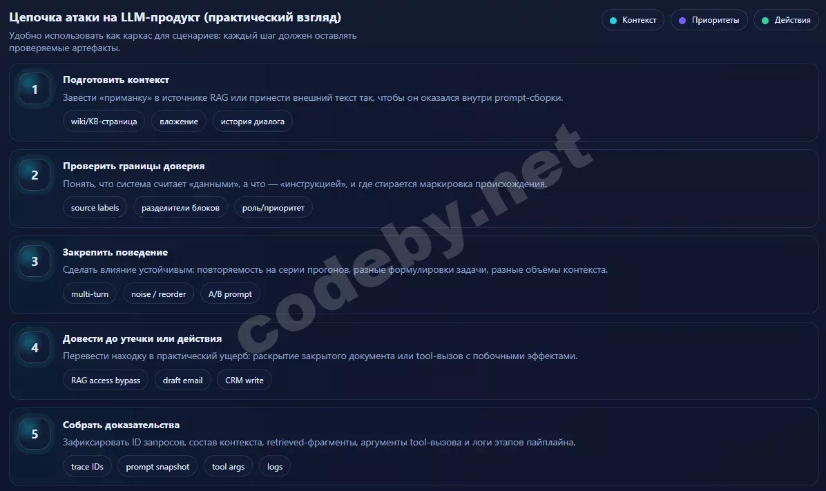 Практический тест строится как проверка доверенных и недоверенных источников. Создаётся документ‑приманка в одном из источников, которые попадают в retrieval, затем модель получает обычную задачу суммаризации или подготовки ответа, а успех фиксируется по факту: смог ли недоверенный контент повлиять на поведение так, будто он имеет высокий приоритет. Самая ценная находка здесь - место, где система вставляет retrieved‑фрагменты без явной маркировки происхождения и тем самым стирает границу доверия.