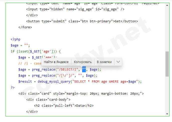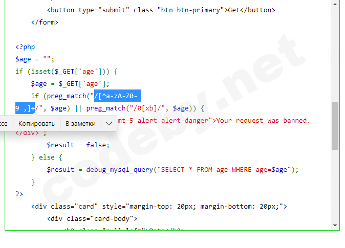 Если посмотрим php CODE , то мы заметим , что у нас фильтруются символы по регулярке ("/[, '()+=\"]+/", '', $age);