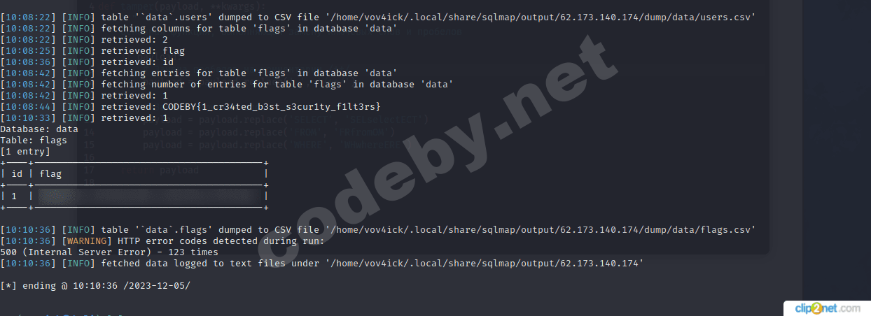 Понимая что мы достаем флаг по букве, зная что фильтруется идем и пишем свой тампер для SQLMAP .