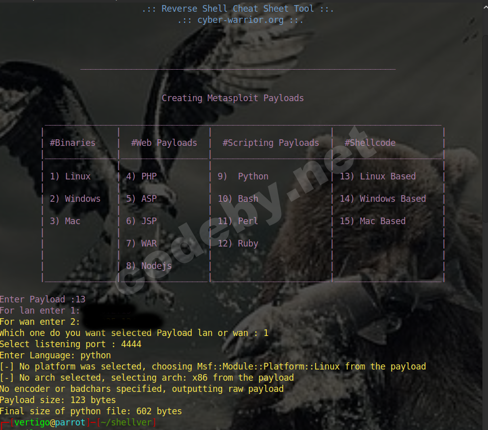 Инструмент вычисляет соединения и определяет IP-адреса и затем спрашивает,на котором из них будем ждать reverse-shell.