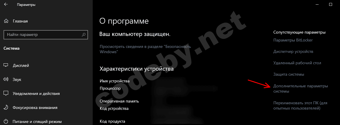 После того, как данная библиотека установиться, нужно будет скачать ffmpeg и прописать к нему путь в переменной среды path. Собственно скачиваем саму программу. Никакой установки она не требует. Достаточно скопировать ее в то место, где она будет жить в последующем и скопировать к ней путь. Далее идем в «Пуск», «Параметры», «Система», «О программе» и в панели справа выбираем пункт меню «Дополнительные параметры системы».