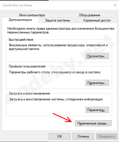 В открывшемся окне щелкаем по кнопке «Переменные среды».