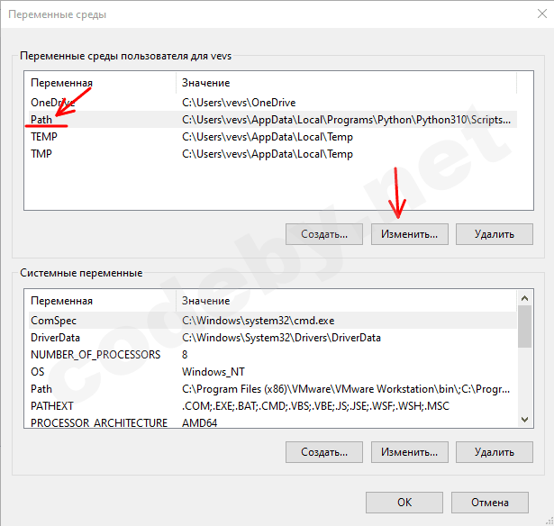 На следующем шаге выделяем переменную Path и щелкаем по кнопке «Изменить».