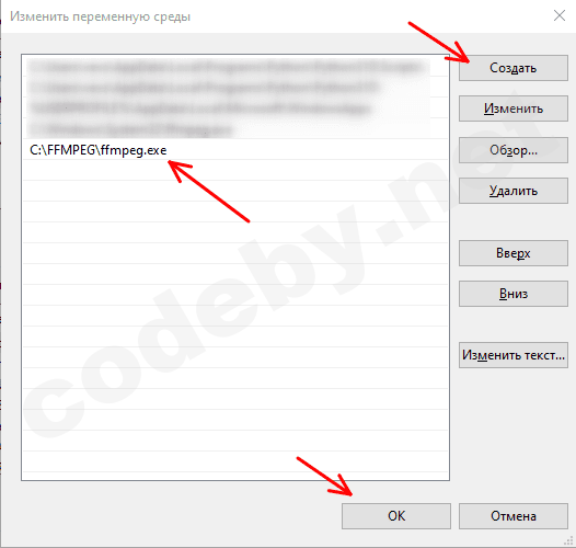 Нажимаем кнопку «Создать» и вписываем путь к исполняемому файлу. К примеру: «C:\FFMPEG\ffmpeg.exe». Путь вписывается без кавычек. После чего жмем кнопку «ОК» и закрываем все открытые ранее окна.