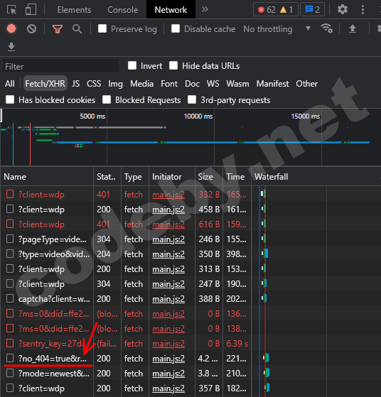 Скажу сразу, что в коде страницы ничего интересного нет. Ну или того, что привело бы нас к ссылке на сегменты видео. Поэтому даже не буду в нем копаться. Перехожу на вкладку Network, выставляю фильтр для запросов Feth/XHR и обновляю страницу с видео. После обновления страницы в консоль посыпалось большое количество запросов. Я, конечно же, предварительно покопался в них и уже знаю, что нам нужен запрос имя которого начинается с ?no_404… Это GET запрос который возвращает JSON с параметрами видео. Вот собственно он на картинке: