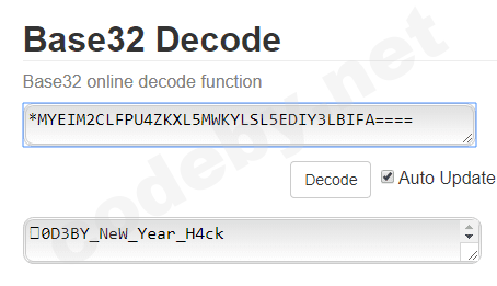 IMYEIM2CLFPU4ZKXL5MWKYLSL5EDIY3LBIFA==== <--- Base32->Decode->C0D3BY_NeW_Year_H4ck