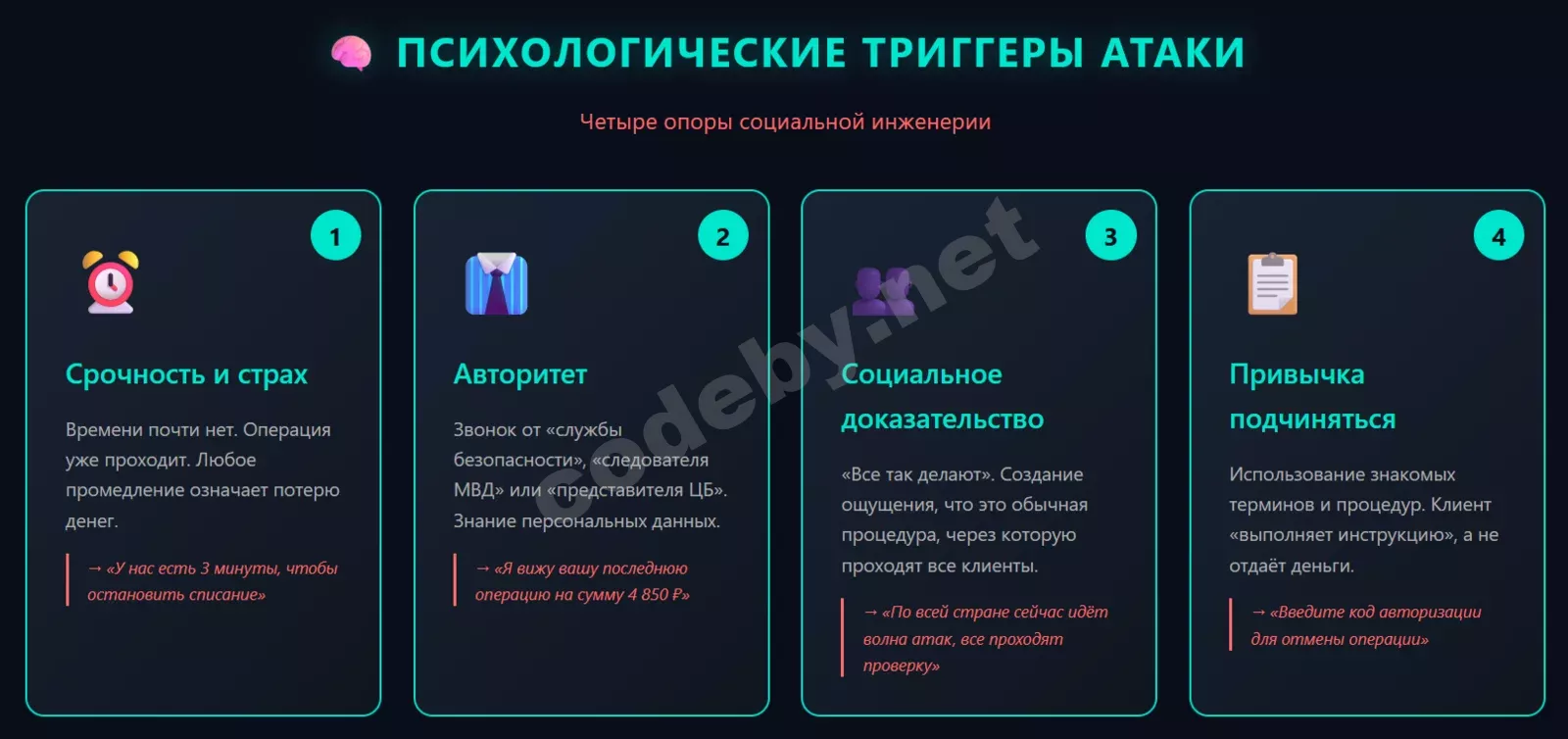 За рамками банковского контекста сами техники социальной инженерии устроены примерно так же. В статье “Атаки социальной инженерии: методы и примеры” можно посмотреть более широкий обзор фишинга, вишинга, претекстинга и других приёмов с примерами.